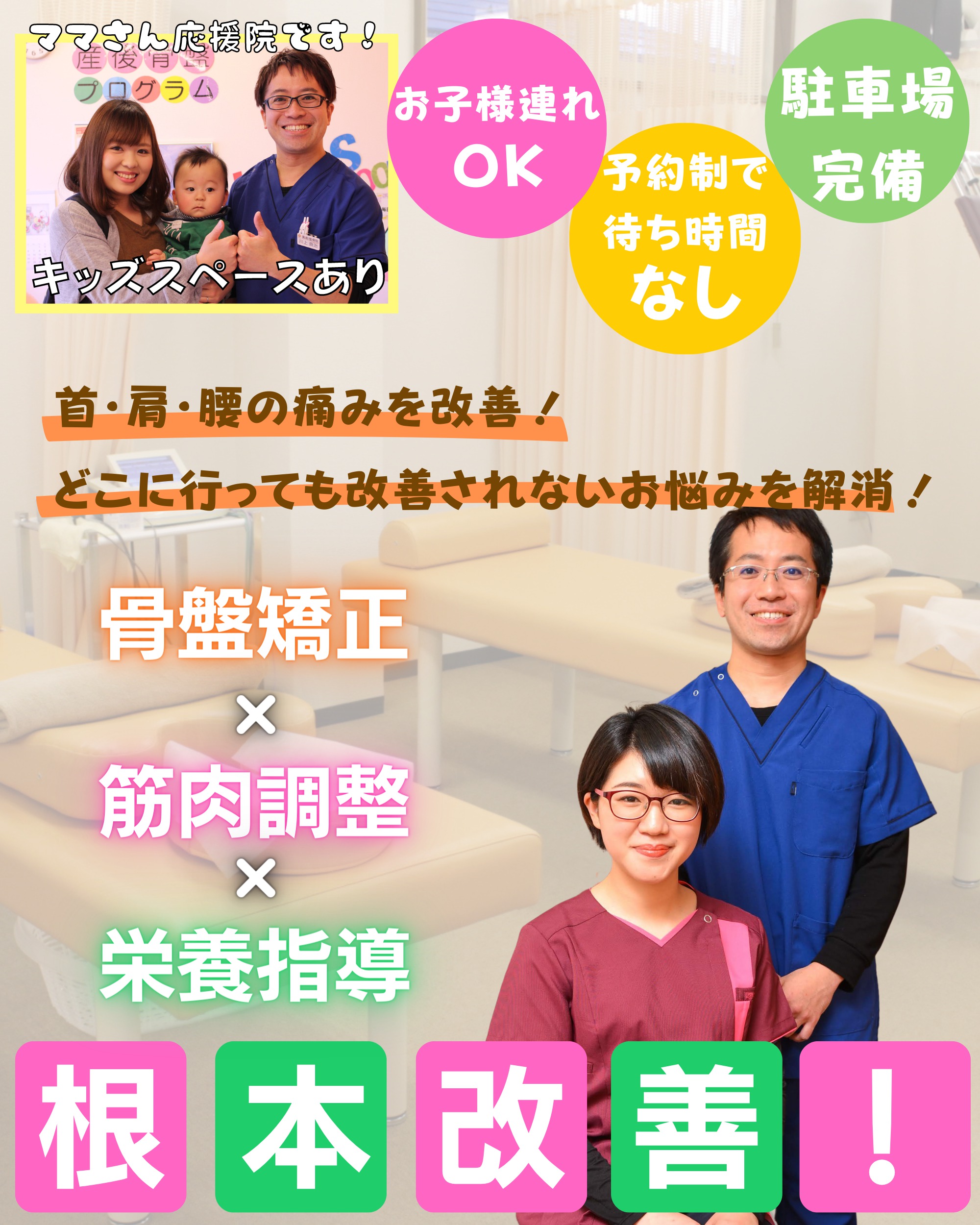 郡山市の整骨院・美翔接骨院は郡山市でも珍しい産後の骨盤矯正に特化した整骨院です。キッズルーム、ベビーベッド等を完備で、子育て経験のある女性スタッフも在籍しております。施術中は女性スタッフがお子様と遊んでいますので、安心して施術を受けていただけます。ベビーカーのまま来ていただくことも可能です。